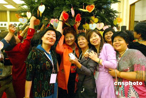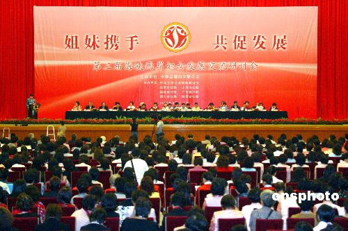 九月十九日,第三届海峡两岸妇女发展交流研讨会在北京人民大会堂开幕。来自海峡两岸及香港、澳门特区的各界知名妇女人士及有关专家、学者等共约1300人出席会议,其中来自台湾地区的知名妇女人士和妇女团体代表700余人,来自香港和澳门特区的妇女代表近百名。与会代表们将通过“妇女创业与经济发展”、“女性教育与性别平等”、“妇女读物与妇女形象”和“家庭教育与儿童发展”等四个专题论坛,就两岸妇女发展问题进行深入研讨。中新社发 张勤 摄