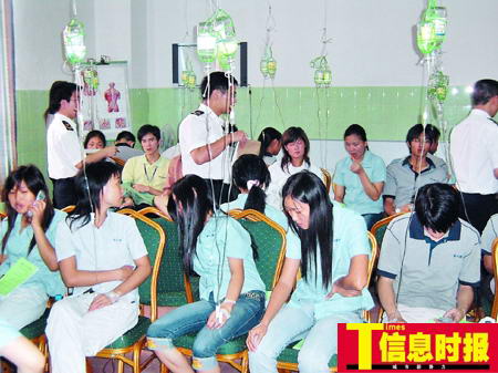在位于8楼的医院办公区,医院学术会议厅被临时用作治疗室,28名富士康员工正在接受输液治疗。这些员工中毒的症状明显,不时有人到卫生间呕吐腹泻,以致于卫生间门口排起了队。据该厂技术员王先生说,前日中午,他和几名同事在工厂G区味帝餐厅吃了中饭。昨日凌晨4时许,他突然感到腹痛,而且头晕,上了多次厕所并吃了药都不起作用。“其他同事也有这样的症状,随后厂方把我们几人送到了医院。”据王先生估计,现在医院输液的富士康员工就有200多人。