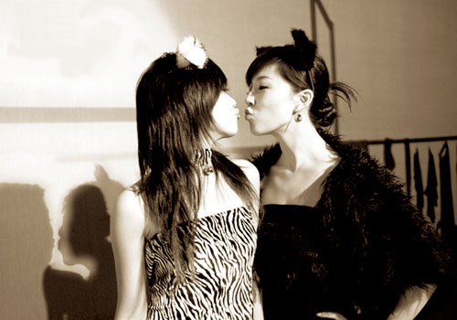 2006年的“超女”比赛中,来自重庆的阳蕾以清纯、健康的小学老师形象赢得了众多支持率,而唐笑则以时尚的舞台剧表演在众多“超女”中独树一帜。上个月退出“超女”舞台的两位清纯选手在大众面前消失了一段时间,但昨日记者在某男性杂志的官方博客上赫然看到标题为“唐笑、阳蕾亲吻照曝光”的页面。页面上有两张精美的时尚照片,照片的两位女主角就是短暂消失的阳蕾和唐笑。