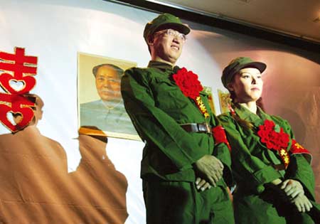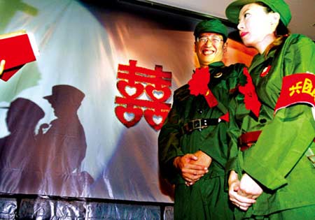 中新网9月25日电 据重庆商报报道,23日,重庆的江北金源大饭店,北京的尹先生和重庆的黄毅小姐穿着草绿色军装、挎着草绿色书包、脚穿草绿色军鞋举行结婚。据称,两人此举是为了让当过知青的母亲重温知青生活。