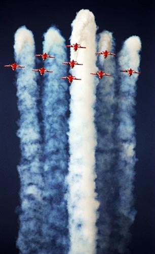 9月26日,印度空军阳光飞行表演队在庆祝印度空军建立70周年庆典上进行表演。