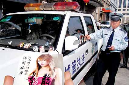 中新网9月27日电 据法制晚报报道,一夜之间,23张色情小广告插满了城管执法车的四周。今天早晨一上班,北京金融街城管执法队员就见到了令人气愤的一幕。