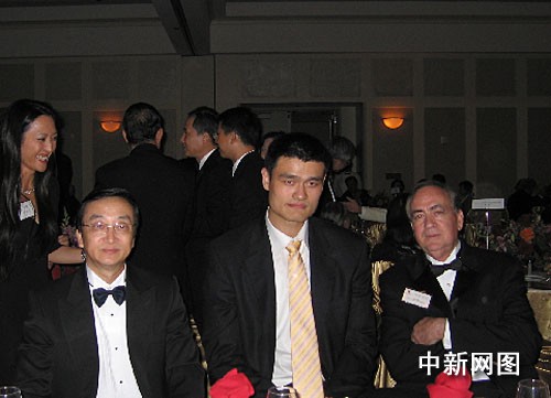 姚明与中国驻休斯敦总领馆华锦州总领事和休斯敦大学校长Jay Gouge先生在庆祝休斯敦大学亚美研究中心成立十周年的晚宴上。