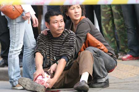 一名30多岁的男子右腿正在流血,他躺在幼儿园前的街面上,身边还有两名年轻妇女正在为他包扎伤口。尽管他的右腿根部已被包扎上了布带,但血仍在汩汩地外涌。离伤者不到两三米远处停着几辆警车,一些民警弯腰在警戒圈内来回寻找着东西。紧挨着警车背后是一家香烟店;烟店门前的地上凌乱地散落着两只米黄色拖鞋,从拖鞋摆放位置可以判断出这里曾经发生过撕扯;锦艺幼儿园的正对面是宝宁宾馆,还有一家新疆葡萄园餐厅,与宝宁宾馆的距离约七八米左右。