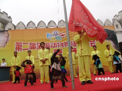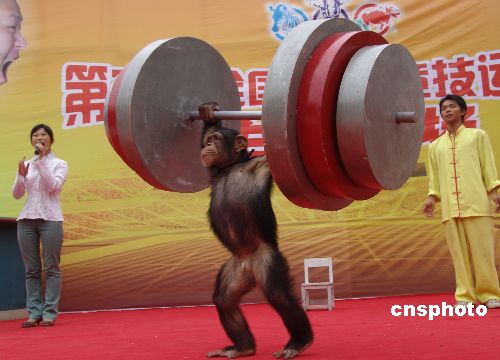9月27日,训兽师加紧训练猩猩和黑熊。重庆野生动物世界将于10月1日至7日上演精彩的“第二届全国动物竞技运动会”,届时,猩猩的举重、跳栏,黑熊的竞走、吊环,鸸鹋赛跑,海狮跳高,捧腹大笑的人、熊、猩猩趣味竞技等节目将一一呈现给游人。工作人员为了让参加比赛的动物们有一个良好的竞技状态,每天正抓紧时间训练它们。中新社发 陈仕川 摄