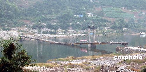 10月17日12时,重庆市云阳县云安斜张桥被成功爆破拆除,三峡工程三期蓄水的最后一座碍航桥没入水中。云安斜张桥是中国第一座斜张桥,位于长江一级支流汤溪河的千年古盐镇云安镇。该桥修建于1974年,全长153米,高25米,宽3.7米。云安斜张桥的建成不仅为我国桥梁建设积累了宝贵经验,也为繁荣三峡盐业做出了积极贡献。自10月3日,三峡工程三期156蓄水的江水开始漫进云安镇以来,斜张桥也渐入江中,为了保证蓄水后的航道通行,该桥不得不提前结束了它的历史使命。中新社发 周斌 摄
