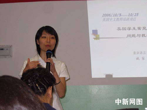 有着多年对外汉语教学实践经验的刘晓雨副教授、施家炜副教授分别以《快乐 实用---针对以了解和运用汉语为目的的第二语言学习着的教学》和《美国学生常见的汉语语音语法问题与教学对策》的主题做了精彩的讲座,并对参加培训的学员们在教学实践中遇到的问题和疑惑进行了认真详细解答,教师们也相互切磋,培训现场气氛十分热烈。