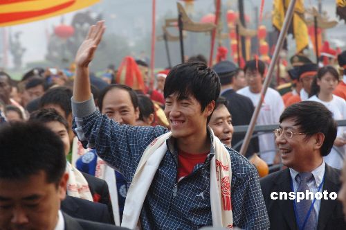 10月20日,出席《2006·盛典西安》大型文化活动的奥运冠军霍尔金娜、迈克尔·约翰逊、涅莫夫、刘翔、田亮、王义夫、高敏、王军霞、李婷、孙甜甜、邓亚萍、滕海滨、李小双等,参加“西安古城迎宾仪式”和“千年古城·巨型题名”活动。中新社发 李海军 摄