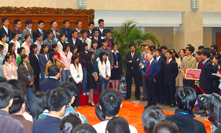 李肇星部长告诉学生自己参加外交工作四十三年,最大的感受是要怀有对祖国最大的热爱,服从祖国人民的利益。李肇星引用“不要问国家为自己干了什么,而要问自己为国家干了什么”这句名言,勉励学生好好学习,为祖国为人民做一点实实在在的事情。