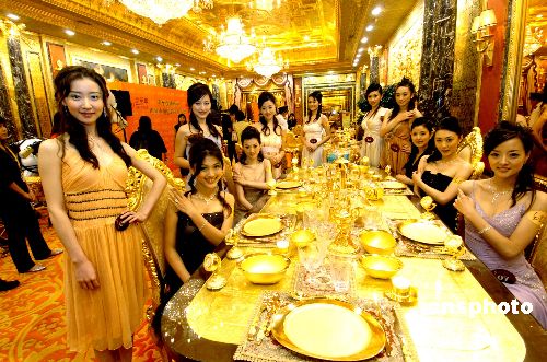 10月23日﹐香港“瑞士号黄金皇宫”特辟专场时间迎接2006中华小姐环球大赛选手参观﹐佳丽们兴奋地参观这座使用2.5吨黄金打造的黄金皇宫﹐亲身体会“金屋藏娇”的惊喜。中新社发 王丽南 摄