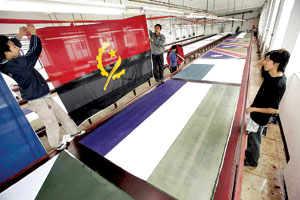 参加此次论坛的非洲国家的国旗的生产企业、北京市惟一一家国旗定点生产企业——北京市京工红旗厂有限公司。走进该公司的车间,看到绳子上挂满了几十面五颜六色、图案各异的各国国旗。几名工人正在忙着给这些国旗剪裁和缝边,并压平。公司总经理白志跃介绍,一个月前公司接到这项任务,一共包括48个非洲国家的国旗。为此,公司全体职工昼夜加班加点,现在工作基本完成。