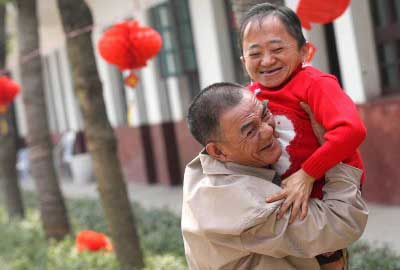 新郎谢新国弯着腰牵着0.7米高的新娘李奎连的手,沿着大红地毯从门口走上搭起的戏台。“你爱我吗?”新娘踮起脚,问62岁的新郎。“我爱你,一辈子都爱你!”满脸皱纹的谢新国对自己38岁的妻子说。10月30日重阳节,在宁乡县煤炭坝镇敬老院负责人的撮合下,居住在敬老院的谢新国和李奎连,幸福地结合了,近千名前来祝贺的乡亲见证了这动人的一幕。