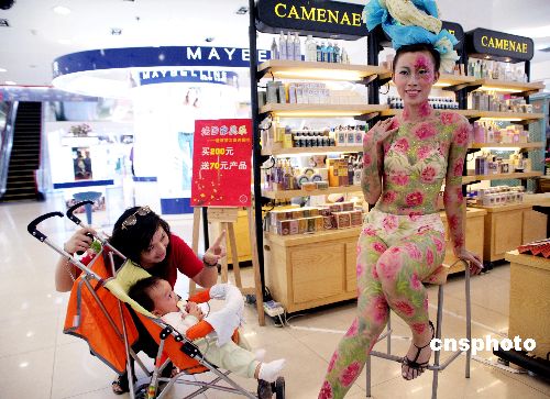 2006年11月4日,广西南宁某百货商场举办一场人体彩绘商品促销活动。这是最近半年多来人体彩绘活动第一次解禁,吸引了很多顾客观看,其中不乏小顾客。中新社发 骆文刚 摄