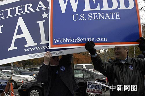 美国国会中期选举十一月七日如期展开。佛吉尼亚民主党参议员参选人吉姆•韦伯当天上午来到佛斯切奇镇的投票站,与韦伯形成竞争之势的共和党参选人是阿伦。阿伦的支持者当天没有集中到这个投票站,他的啦啦队在韦伯的支持者中成了少数派,连牌子也被韦伯支持者故意遮挡。邱江波 摄