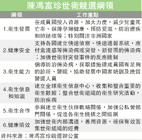 陈冯富珍的竞选政纲主要有6项,包括要求会员国投入资源预防及治疗艾滋病。此工作早在05年1月,前总干事李钟郁在全球艾滋病防治进展报告内提出,要为发展中国家的300万艾滋病人治疗,可惜其宏愿未完成便过世。