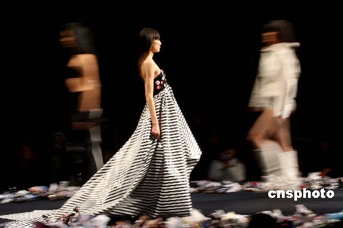 十一月十九日,在北京进行的中国国际时装周二零零七春夏系列时装发布会上,五位来自俄罗斯的著名时装设计师分别为观众展示了其大胆、想象力丰富的时装设计。图为模特演绎被誉为站在时尚前沿的“勇士”、俄罗斯著名时装设计师尤利娅·尼古拉埃娃设计的时装。中新社发 盛佳鹏 摄