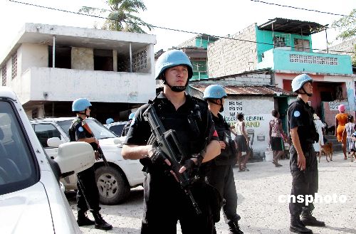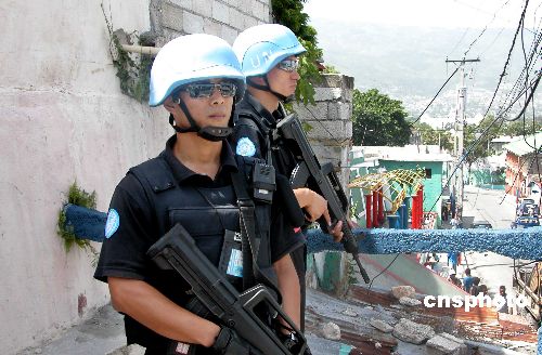 6月28日是海地重大的宗教节日,海地总理雅克·阿莱克斯出席在首都太子港贝莱尔地区大教堂举行的欢庆仪式并发表演讲。贝莱尔地区是海地非法武装的集中居住地,海地总理活动的安全警卫工作主要由中国防暴队负责。 中国防暴队派出三个分队早上6点赶到贝莱尔地区大教堂附近,对周围建筑物和周围地形进行勘查,尤其是对非法武装分子遗留的空房子重点搜查,控制制高点,在重点路段和路口进行武装巡逻。早上8点,成千上万的当地群众涌向大教堂,载歌载舞,人声鼎沸,中国防暴队及时调整警力,加强教堂周围的安全总理保卫措施。9点钟总理雅克·阿莱克斯演讲到直到活动结束,中国防暴队确保了海地总理在整个活动中的安全。中新社发 陈 进 摄