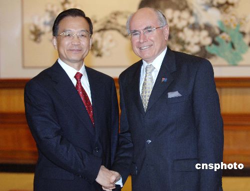 霍华德说,温家宝总理今年早些时候对澳大利亚的访问有力地推进了澳中关系。澳方认为,中国经济快速发展,为包括澳大利亚在内的各国带来新的机遇。澳方愿与中方共同努力发展澳中21世纪互利共赢的全面合作关系。霍华德赞同温家宝提出的深化两国关系与合作的建议。他说,澳中文化背景不同,但两国关系发展良好。广东液化天然气项目投产是澳中经济关系进一步加强的重要标志,表明两国经贸合作具有广阔前景,通过合作可为两国开创更加美好的未来。澳大利亚能源资源丰富,可为中国发展提供长期、稳定、优质的能源。我们愿与中方继续努力,本着优势互补、互惠互利、互谅互让的精神加强并扩大经贸、能源资源等领域的合作,积极推进自贸协定谈判与和平利用核能合作,促进澳中和本地区的共同发展。霍华德说,澳方愿就地区和国际问题加强与中方的交流与合作。