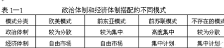 政治体制改革的取向,有一个与经济体制改革模式的搭配问题。从决策、控制方式和资源分配方式讲,政治体制与经济体制有四种搭配模式:一是集中的政治体制与集中的经济体制搭配,民主化程度很低,政治上高度集中,由国家集中配置和分配经济资源,排斥市场的分散决策和选择。典型的有朝鲜、前苏联、改革开放前的中国、东欧诸国等,可称之为前苏联模式。二是较为分散的政治体制和较为分散的经济体制搭配,多党竞政、新闻自由、政治决策较为分散,资源基本由市场进行分配,生产什么、生产多少、怎样生产,由市场调节,投资、消费和要素供给由投资者和家庭分散决策。目前,欧洲一些国家和美国经济体制和政治体制的搭配可能最接近于这种模式,可称之为欧美模式。三是较为分散和自由的经济体制和适当集中的政治体制相搭配,经济上实行市场经济体制,资源由市场进行分配,政治上强调适当的集中。亚洲日本、韩国、台湾、新加坡、香港等国家和地区在它们经济发展转型时期,都曾经实行过这样的搭配体制。(注释:甚至有的学者认为,东亚经济在它经济和社会结构的转型期中,是强权政治下的自由市场经济。)目前中国、越南等国家,实行的基本上也是这种体制,可称之为前东亚模式。四是政治上高度分散化,经济上高度集中。这样的体制在实际生活中是不存在的。因为政治决定于经济基础,经济上高度集中的体制不可能产生分散的政治体制。(表1-1)
