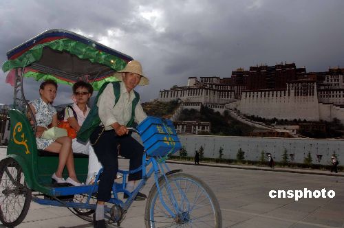 六月三十日,一辆旅游观光三轮车载着游客经过布达拉宫广场。据西藏自治区文物局消息:从七月一日开始,布达拉宫将控制每天参观人数不超过二千三百人次,其中包括游客和朝佛群众。中新社发 韩艺冰 摄