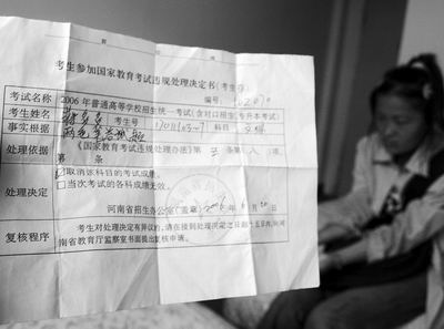 蒋多多说着,从书包里掏出那份《考生参加国家教育考试违规处理决定书》:蒋多多,科目,文综,取消该科目的考试成绩。