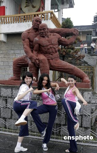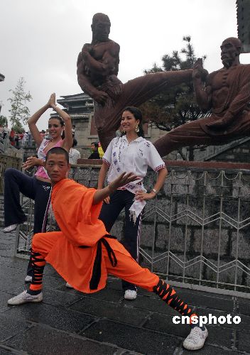 7月3日,来自世界五大洲87个国家和地区的国家旅游小姐大赛佳丽们在瓢泼大雨中前往郑州嵩山少林寺参观。佳丽们一下车就被眼前景象惊呆,经管大雨滂湃,迎接她们的数千名少林寺塔沟武术学校的学生们毅力在风雨中一丝不动,少林武僧更是冒着大雨在广场上为佳丽们表演叹为观止的中国少林功夫。中新社发 俊影 摄