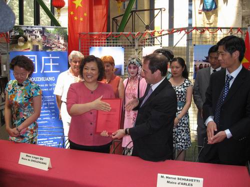 在开幕式上,阿尔勒市市长HervéSchiavetti和周庄镇党委书记屈玲妮还签署了周庄-阿尔勒经济文化合作总协议。根据协议,阿尔勒市将帮助周庄进行文化遗产的考察和评估,这意味着周庄在文化遗产保护工作中将迈出重要一步。这也是继今年五月阿尔勒市代表团访问周庄,签署周庄-阿尔勒旅游合作备忘录后的又一重大举措,标志着周庄文化品牌正式亮相国际舞台。