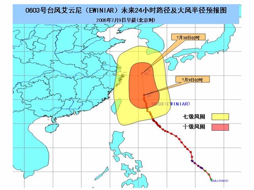 中新网7月9日电 中央气象台今晨发布最新台风警报说,今年第3号强台风“艾云尼”(EWINIAR)已于今天凌晨在东海南部海面减弱为台风,今天早晨5点钟台风中心已经移到上海市东南方大约630公里的东海南部海面上,也就是北纬26.8度,东经126.0度,中心附近最大风力有13级(40米/秒)。