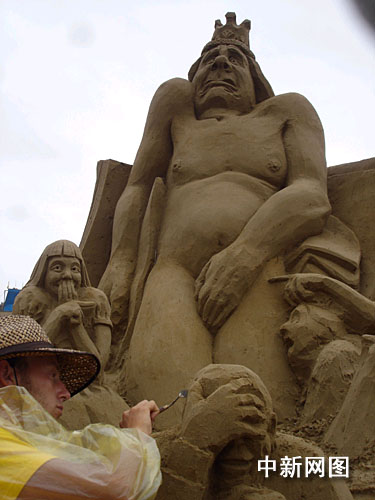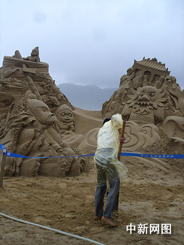 场边的工作人员正忙着整理沙地,而沙雕艺术家们穿着雨衣,顶着大风抓紧最后的时间进行雕刻, 沙雕手朱凯华说:“沙雕节就要开幕了,工程赶着尽快结束,今天晚上必须要结束了,还有灯光什么都要布置,到明天已经来不及了,我们昨天晚上加班到十点,前天晚上也加班。”因为风大,沙雕区的浮沙也被吹得漫天飞扬,沙雕艺术家们只能创作一部分后马上用胶水固定。