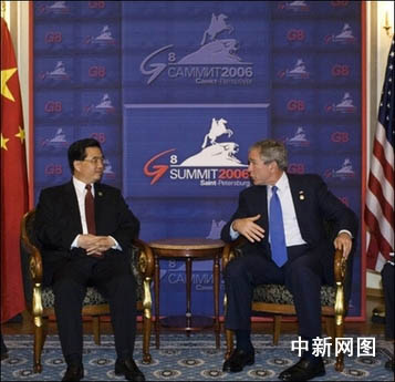 中新社圣彼得堡七月十六日电 (记者 朱大强)刚刚抵达圣彼得堡出席八国集团与发展中国家领导人对话会议的中国国家主席胡锦涛,在这里首先与美国总统布什会晤。