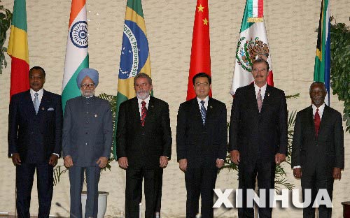 国家主席胡锦涛16日在俄罗斯圣彼得堡同前来出席八国集团同发展中国家领导人对话会议的巴西总统卢拉、墨西哥总统福克斯、南非总统姆贝基、刚果(布)总统萨苏、印度总理辛格五个发展中国家领导人举行集体会晤。六国领导人就加强发展中国家合作、促进共同发展等问题交换了看法。