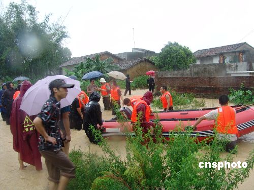广东惠州市博罗县发生百年不遇特大洪涝灾害中,当地消防大队官兵经过两夜三天的奋战,先后抢救出千余名被洪水围困的民众。图为该大队大队长段建国、教导员林国阳在带领队员们抢救被洪水围困的村民。中新社发 宋秀杰 摄