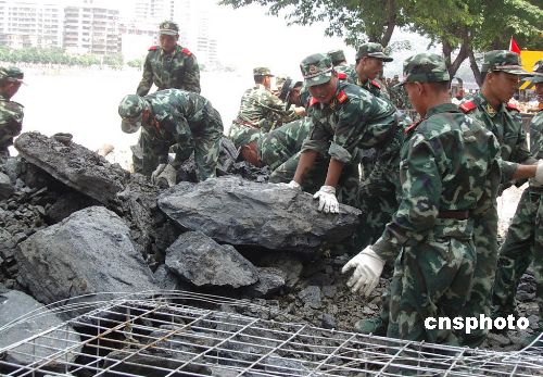 七月十八日,侵袭广东韶关的洪水已退到警戒线以下。清晨,在韶关市区武江边西堤路临江河堤出现塌方。缺口长四十多米,宽约七米。警方临时封闭道路,当局立即组织抢修。图为韶关市武警支队出动三百余官兵参加抢修。中新社发 冯昶 摄