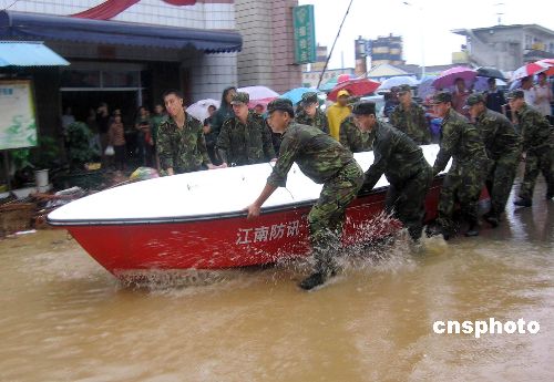 七月十八日,广西首府南宁遭受大暴雨袭击,当日凌晨至中午十二时,部分城区降雨量超过三百毫米,致使市区多处内涝,道路中断,交通受阻。该市江南区肉禽蛋农贸批发交易市场发生严重内涝,百余人被困。图为武警出动救助艇解救被困民众。中新社发 王刚 摄