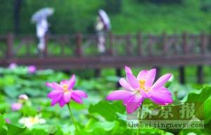 昨日上午,蒙蒙细雨中,第十一届圆明园荷花节开幕,荷花节将持续到8月20日,市民和游客可以在园内欣赏到12万平方米的各色荷花。延续9年的圆明园荷花节去年曾因“防渗膜”事件而暂停。