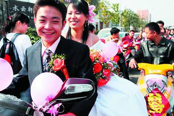 新郎周培介绍,他是某电动车行的员工,2004年与前来车行买车的女孩袁雅瑾相识,两人相互有了好感并开始谈起了恋爱。经过2年时间的爱情长跑,他们决定携手步入婚姻的殿堂。筹备婚礼时,他本打算像其他人一样,组织一支豪华车队风风光光地去迎娶新娘。但他们觉得这种形式太铺张,也没有任何创意。“我和妻子是通过电动车才相识相知相爱的,电动车可以说是我们的‘红娘’。于是我便想到了用电动车去接亲,这种方式不仅非常节约,而且极富创意。”周培乐呵呵地说。