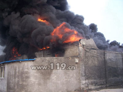 到达火灾现场后,经过指挥员火情侦察,发现发生火灾的为一座储存油漆等化工危险品的简易仓库,火势处于迅猛发展阶段,并迅速向东面相邻的山东电视台存放布景道具的仓库蔓延(里面存放着价值50万元左右物资),情况十分危急,中队指挥员立即兵分两路,15吨水罐车出单干线两枪操,一支枪在南侧仓库上方压制化工品仓库内部火势,另一支枪控制住正向东蔓延的火势,防止引起更大面积的火灾。中队斯太尔泡沫水罐于物资仓库北侧,出单干线一支枪压制火势防止火势向北侧民用房蔓延。