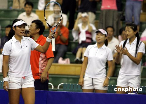 中国头号女子网球选手李娜,7月16日在北京举行的联合会杯争夺世界组八强资格“中德大战”中以2比0艰难战胜德国名将沃尔勒,使中国队在总比分上以3比0领先德国队奠定胜局,首次闯入世界女子网球团体赛最高级别的世界组八强。获胜的李娜接受队友郑洁(右二)、晏紫(右一)的祝贺。中新社发 任晨鸣 摄