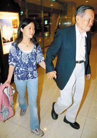 中新网7月5日电 诺贝尔物理奖得主杨振宁4日晚带小他54岁的太太翁帆赴台,这是他们结婚后第一次到台湾,下飞机后就引起媒体追逐。两人抵达下榻的饭店时,杨振宁自然地牵起翁帆的手,两人面露微笑且十指紧扣。