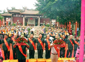 4日上午,随着司仪的一声“祭祖大典,现在开始”。鼓吹、旗手、武生、主祭、陪祭等各就各位,接下来就是三跪九叩、上香、献花、献果、献帛等一系列的仪式,仪式进行得井然有序又非常隆重,随后还进行了武生祭祖的表演仪式,让鹿港天后宫的香客们大开眼界。