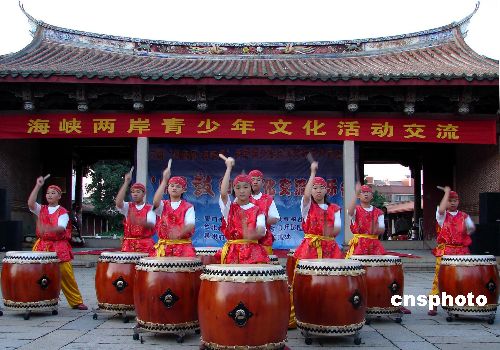 | 7月2日,台北县新庄市鼓艺团的小鼓手们在福建泉州表演《节令鼓》。在雄浑深沉的鼓声的鼓声中,“中华鼓韵”海峡两岸青少年文化交流音乐会当日在泉州文庙举行,来自台北的新庄鼓艺团、金门开王宣小学及泉州市艺术学校的青少年们分别表演了各自拿手的鼓艺、南音、梨园剧等节目。新庄鼓艺团团长蔡文儒介绍,这是他们第一次到祖国大陆表演,两岸同胞都是炎黄子孙,表演的节目本着同根同种的原则,挑选了中国24节气的“节令鼓”等。中新社发 傅丹丹 摄