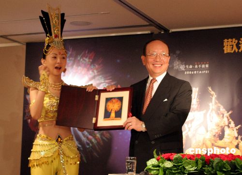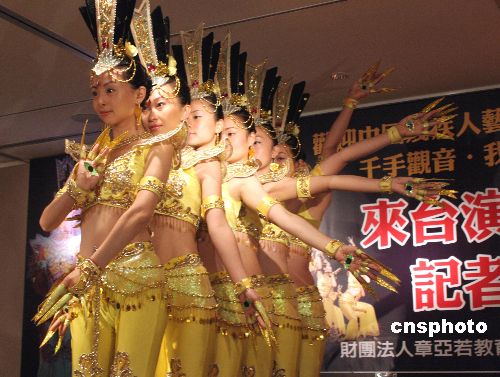 七月六日, 由“千手观音”领舞邰丽华率领的中国大陆残疾人艺术团在台北举行记者会,引起岛内数十家媒体的关注。记者会上艺术团成员表演了“千手观音”。中新社发 邹辉 摄
