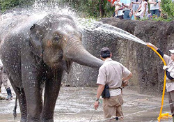 连日高温热坏了动物园的动物,台北市立动物园的工作人员贴心地帮大象喷水洗澡,消消暑意。(台湾《中国时报》图 刘宗龙 摄)
