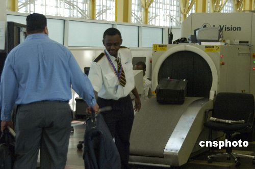 在美国各大机场“执勤”的主流安检仪器,是结合X光和其他透视科技的最新安全检测仪器,其体积比一般在政府部门执勤的安检仪器大了许多,从头到尾共有将近三米长,上面用英文写着其品牌“InVision”,据介绍,一般古体和金属的物体,在这台机器前可以一览无余,但是液体的材料却不敏感。美国官员称正加紧研制新型仪器。图为八月中旬,美国里根机场安检人员检测托运行李。中新社发 邱江波 摄