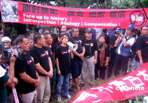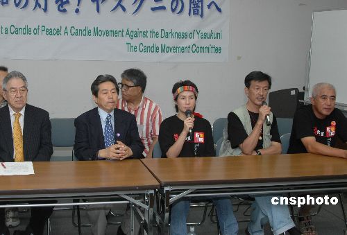 来自中国台湾、韩国与日本的参加“和平之灯”行动的战争遗属八月十五日在东京日比谷公园集会游行,抗议日本首相小泉纯一郎无视民众呼声,执意参拜供奉有二战甲级战犯的靖国神社。