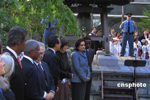 九月二十一日是“国际和平日”,联合国总部举行鸣钟仪式纪念这个日子,安南以秘书长的身份最后一次敲响和平钟,联合国在世界各地的机构也纷纷举行各种形式纪念活动。在这次纪念“国际和平日”的活动上,安南宣布任命马友友为联合国“和平信使”。图为鸣钟仪式现场。中新社发 美分 摄