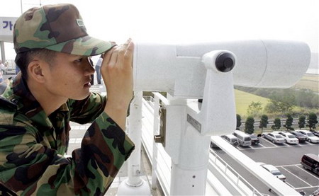 中新网10月9日电 据美联社报道,朝鲜当地时间当天11时已成功进行了核试验,韩国总统卢武铉已召集安全顾问开会进行讨论。图为韩国士兵在密切监测动态。(春风)