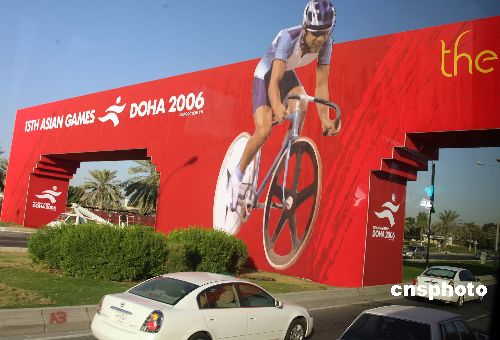十一月二十八日,卡塔尔多哈街头的大幅宣传画展示这里浓郁的亚运会气氛。第十五届亚运会将于十二月一日在卡塔尔首都多哈开幕。中新社发 毛建军 摄