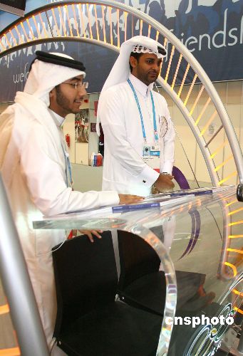 十一月二十八日,卡塔尔首都多哈亚运会媒体中心的工作人员正在热情接待各国记者的抵达。新颖别致的接待台、身着纯百服饰的工作人员吸引了不少记者围观。中新社发 廖文静 摄