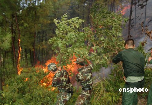 连日高温,重庆市山火时有发生。八月十二日,重庆市壁山县火灾仍未扑灭。十一日,该市沙坪坝、璧山、巴南、南岸、九龙坡等五区县发生较为严重的火灾。重庆市璧山县狮子镇华龙村森林大火一度失控蔓延长达五公里。中新社发 万明 摄